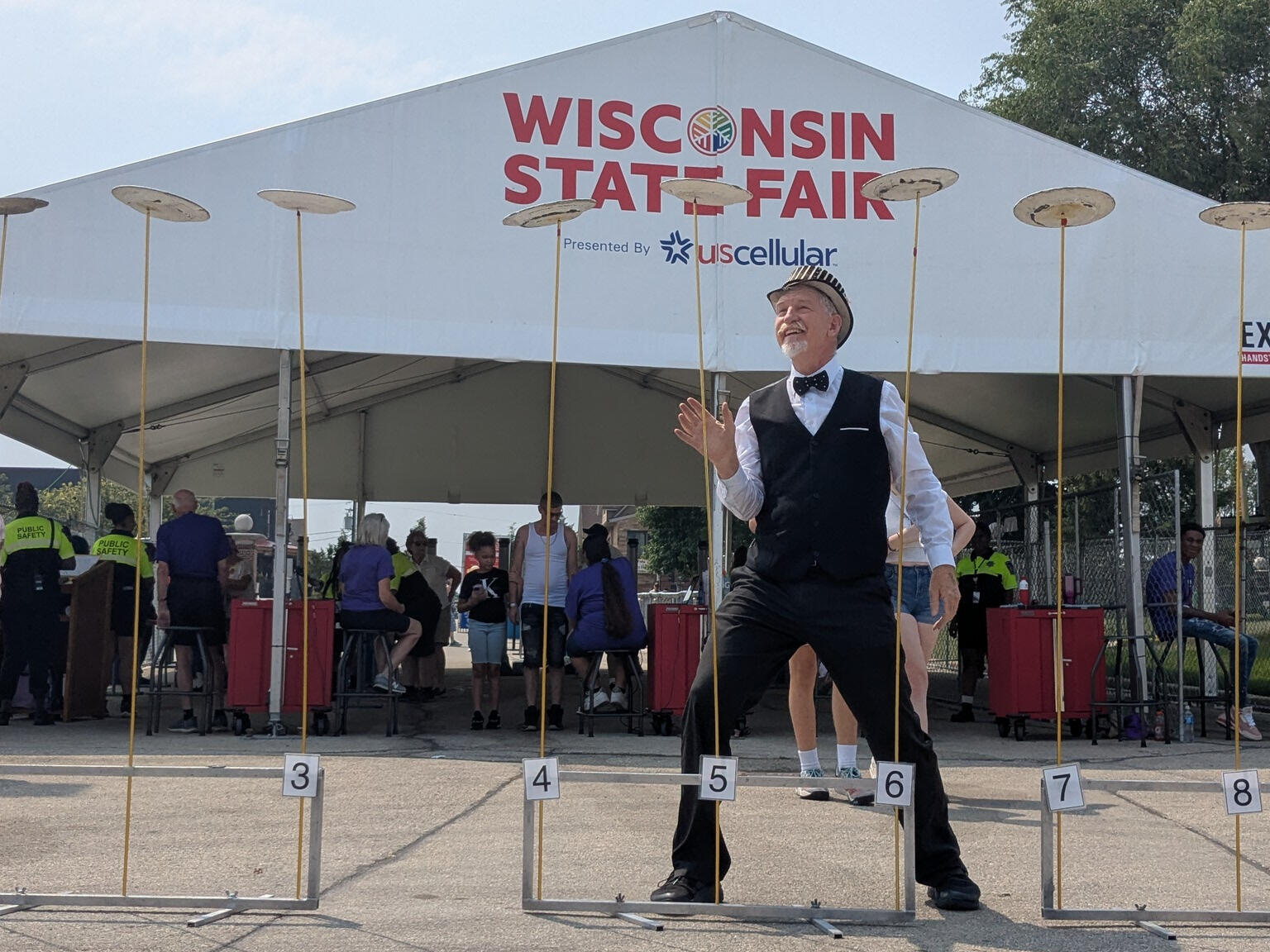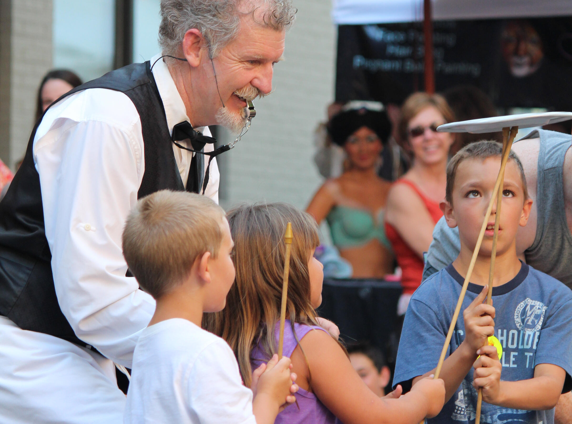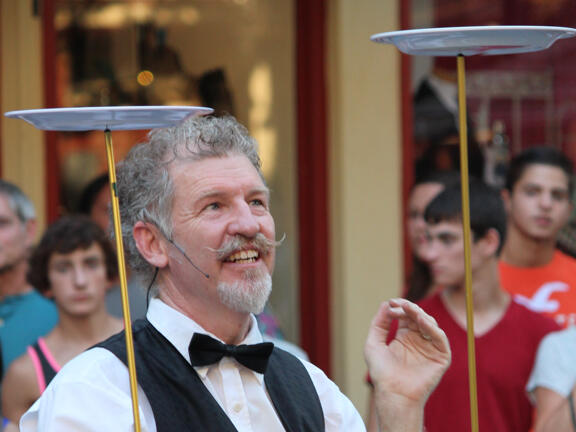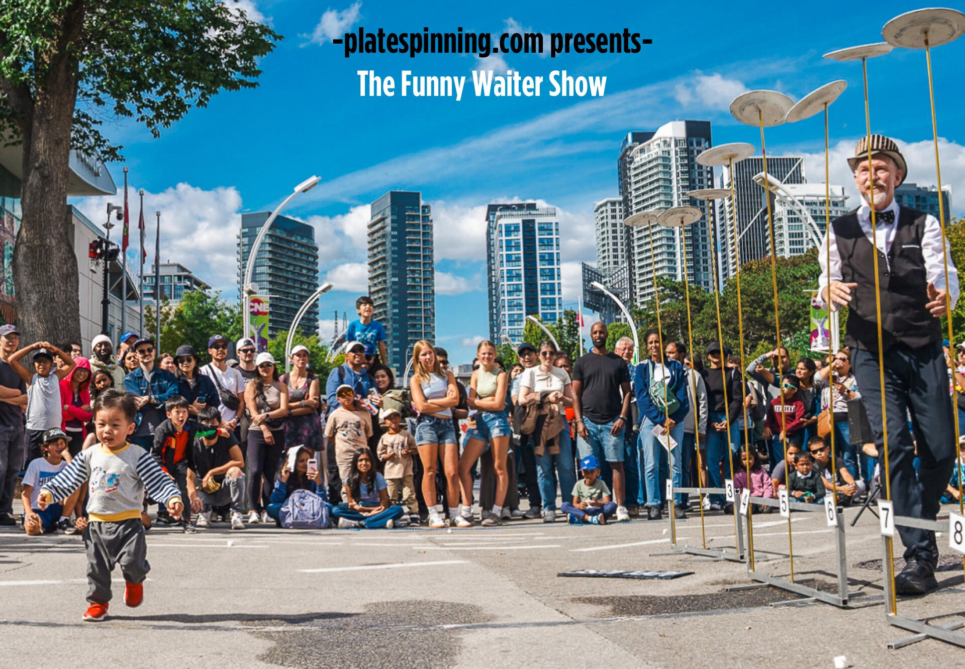 The Funny Waiter show is a unique variety act that delights the audience with plate spinning, table cloth pulling, rubber chickens, marshmallows as flying object plate dancing, laugh out loud comedy, audience participation with kids and adults alike. The adults don't get wet but that's not guaranteed for the kids!